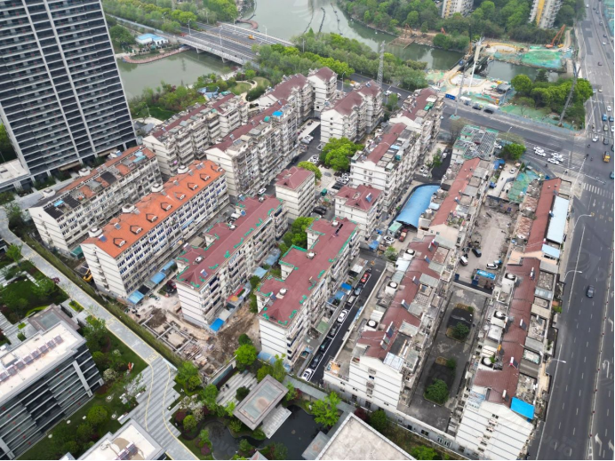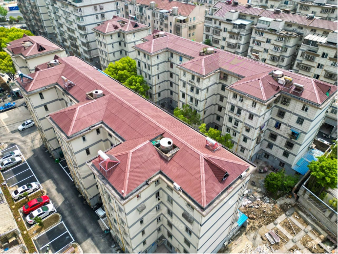 “月秀東園平改坡項(xiàng)目”位于無(wú)錫市濱湖區(qū),小區(qū)建成于1981年,其中部分樓棟的屋面為平屋面,部分屋面為坡屋面。對(duì)原先平頂屋面的樓棟進(jìn)行坡屋面改造,采用幻景波形瀝青瓦施工,達(dá)到整體造型的統(tǒng)一,提升住戶居住舒適性。