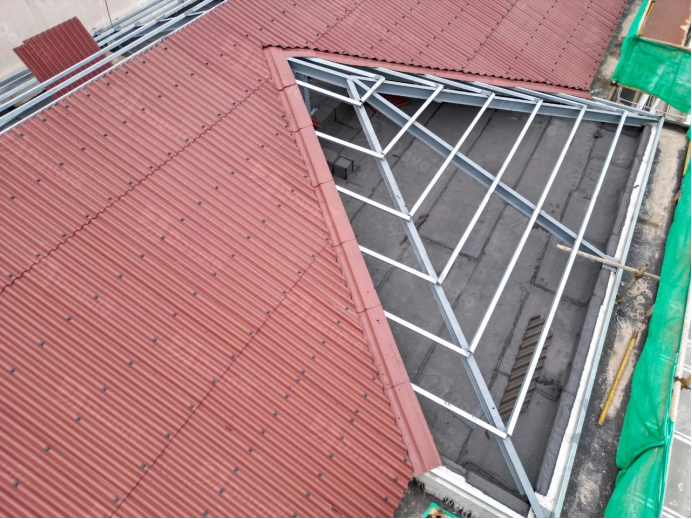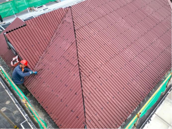 “無(wú)錫月秀東園項(xiàng)目”采用單層波形瀝青瓦的施工方案,將原先的平頂屋面清理后涂刷防水涂層,在平頂屋面上搭建坡屋面鋼構(gòu),使用瓦釘將波形瀝青瓦固定至鋼檁條。