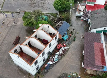 受災嚴重的村子房屋以低、多層磚瓦房為主,大面積屋蓋瓦片被吹落,門窗受飛擲物破壞,部分門窗受風吸力發(fā)生外吸現(xiàn)象。