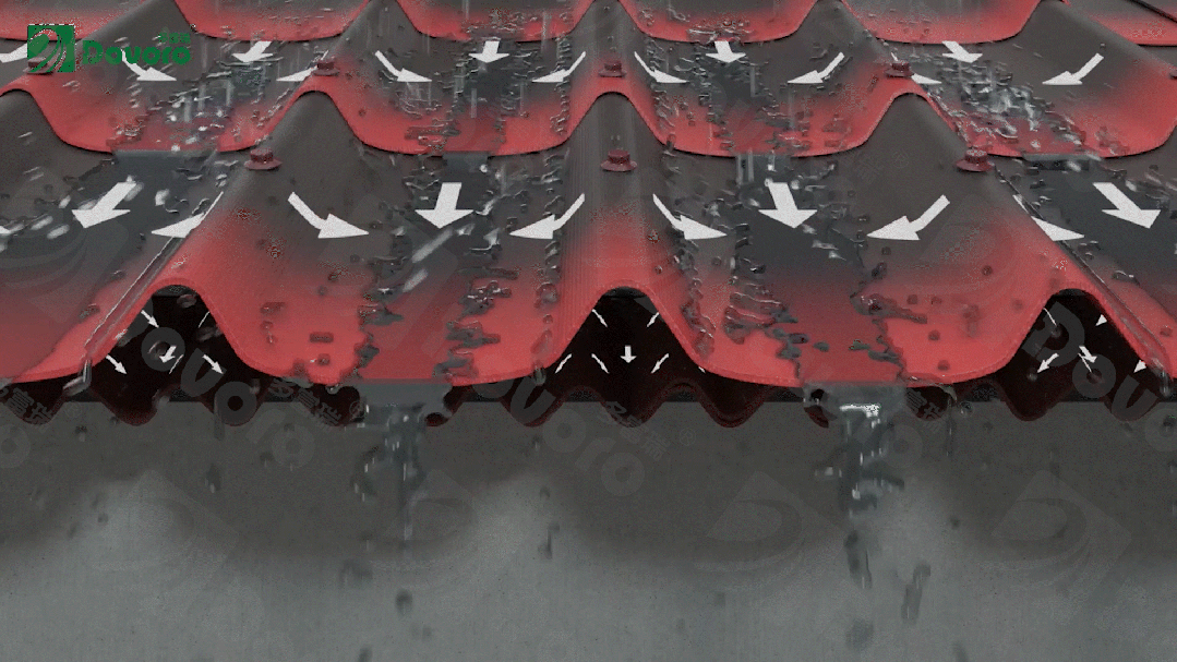 波形瀝青瓦與波形瀝青防水板,采用瀝青作為原材料之一,瀝青含量≥40%,大大提升瓦材的防水效果。在造型設計上,使用波浪的排水造型,防排結合,提升屋面整體的防水性能。