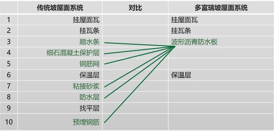 輕質(zhì)坡屋面系統(tǒng)的核心材料——波形瀝青防水板,替代傳統(tǒng)屋面中的順?biāo)畻l、混凝土保護層、鋼筋網(wǎng)等一系列工序,將各種工序集成到一張防水板中,使得整個坡屋面的構(gòu)造無比簡單。