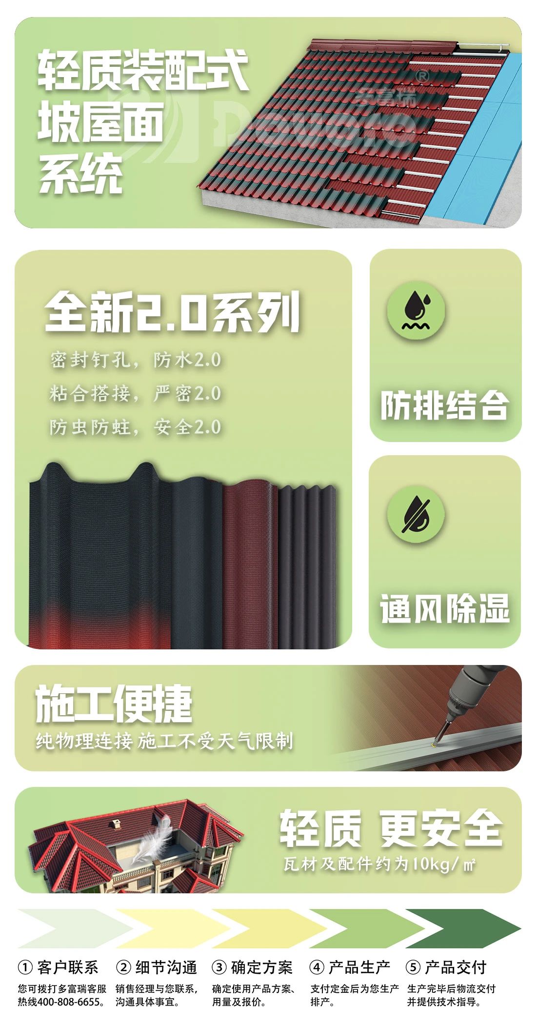 多富瑞輕質(zhì)坡屋面系統(tǒng)為“碳中和”貢獻(xiàn)出一份力。輕質(zhì)坡屋面系統(tǒng)的施工過程中,不產(chǎn)生污水廢氣,無需大型設(shè)備,對環(huán)境無污染,能源消耗極小。