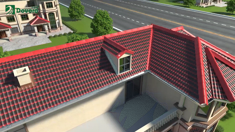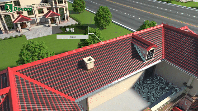 在屋脊前后坡的兩塊波形瀝青防水板接縫處,粘貼通風(fēng)卷材。通風(fēng)卷材有利于氣流流通,同時(shí)可以提供防水防塵的保護(hù)。最后在上方鋪設(shè)特制的脊瓦。