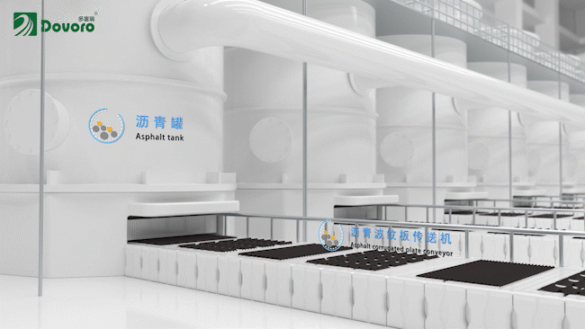 成形的波紋紙板經(jīng)過傳送機,送到了瀝青罐中,這正是它蛻變成一塊合格的防水板最重要的一步。