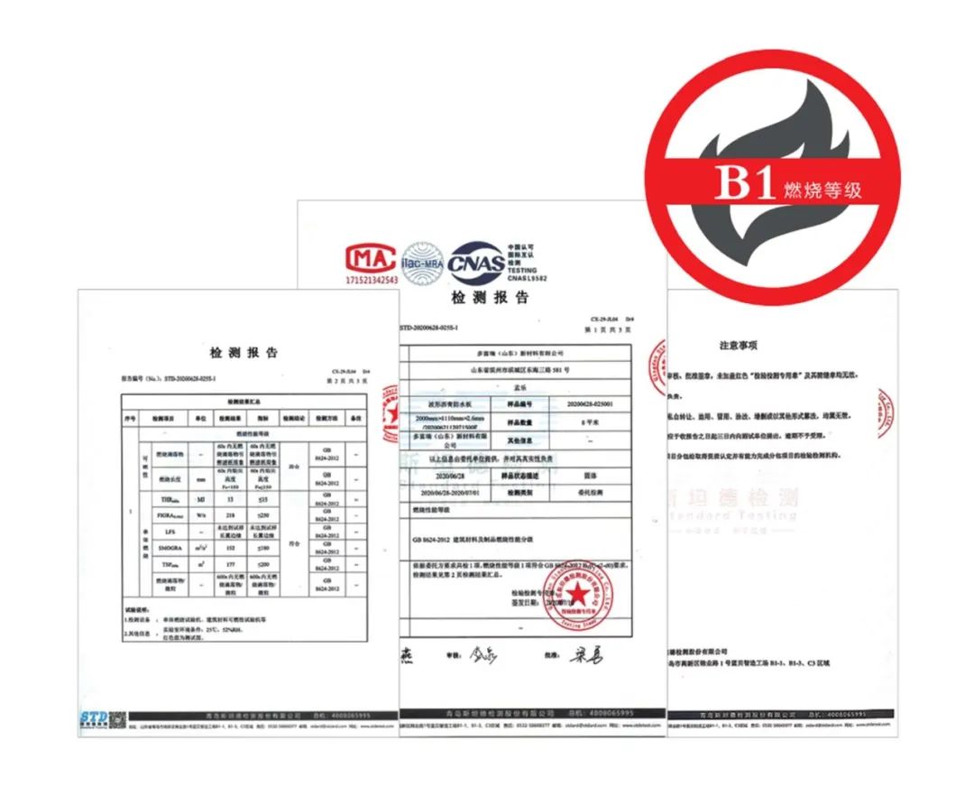 多富瑞2.0系列產(chǎn)品,包括波形瀝青瓦和波形瀝青防水板均符合最新的《建筑材料及制品燃燒性能分析》(GB8624-2012)B1級防火標(biāo)準(zhǔn)。