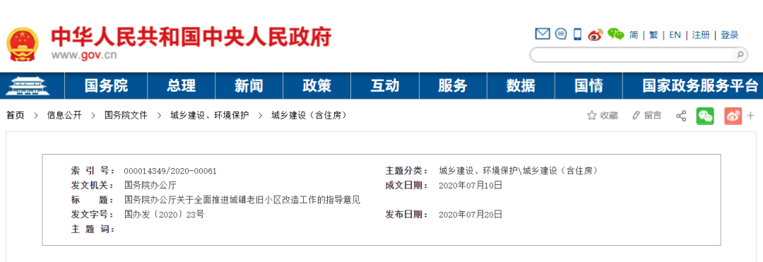 2020年7月20日國務(wù)院辦公廳發(fā)布《關(guān)于全面推進(jìn)城鎮(zhèn)老舊小區(qū)改造工作的指導(dǎo)意見(國辦發(fā)〔2020〕23號)》,指導(dǎo)意見中指出城鎮(zhèn)老舊小區(qū)改造是重大民生工程和發(fā)展工程,對滿足人民群眾美好生活需要、推動惠民生擴(kuò)內(nèi)需、推進(jìn)城市更新和開發(fā)建設(shè)方式轉(zhuǎn)型、促進(jìn)經(jīng)濟(jì)高質(zhì)量發(fā)展具有十分重要的意義。